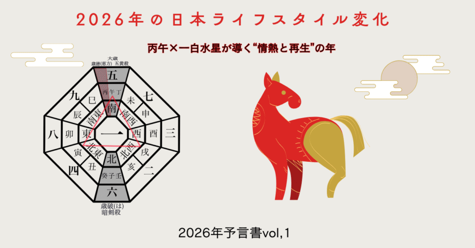 ホームお知らせ 2026年の日本ライフスタイル変化 ― 丙午×一白水星が導く“情熱と再生”の年【2026年予言書vol,1】 2025年11月1日 This content is restricted to site members. If you are an existing user, please log in. 既存ユーザのログインユーザー名またはメールアドレスパスワード上に表示された文字を入力してください。 ログイン状態を保存する